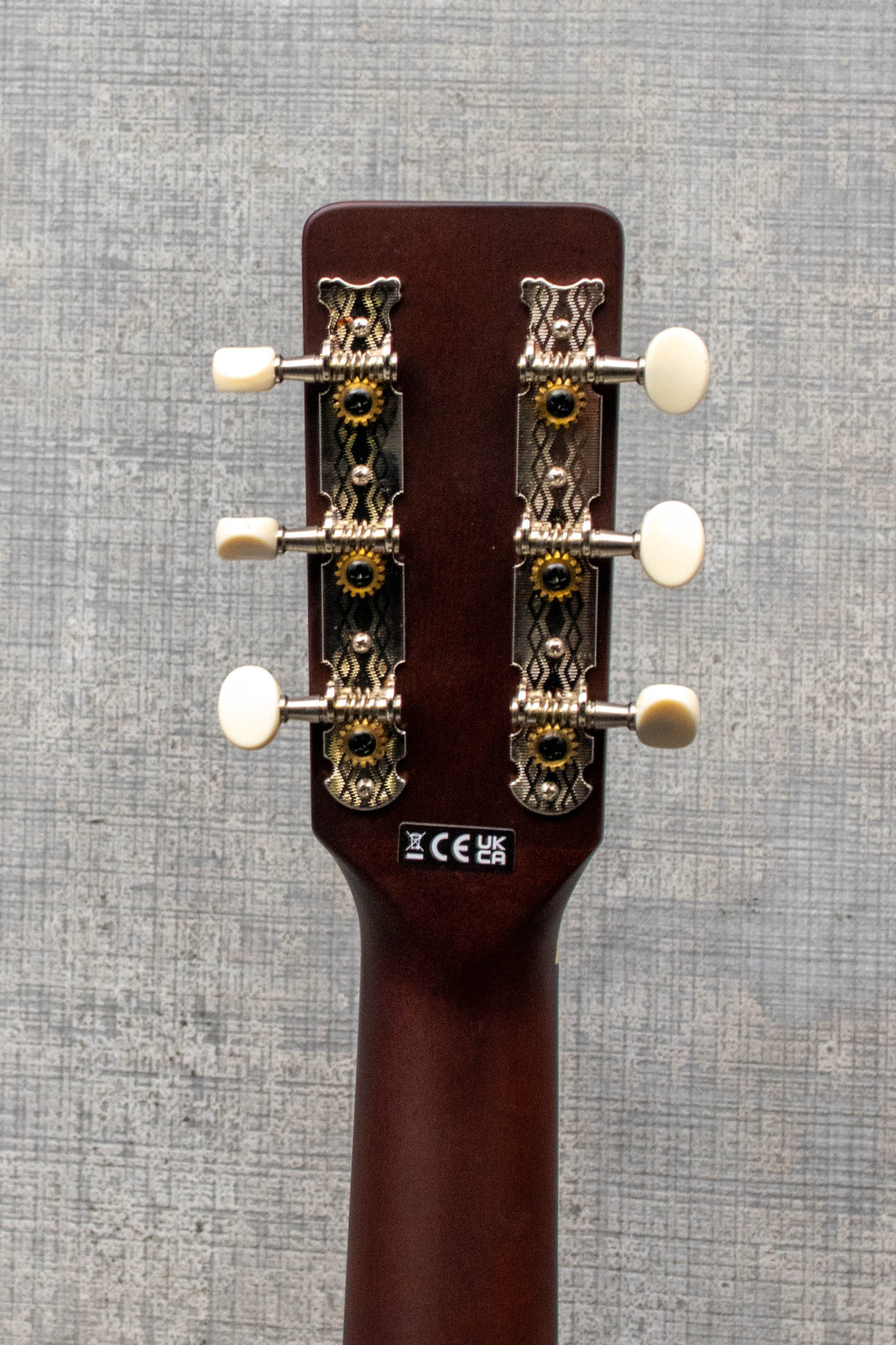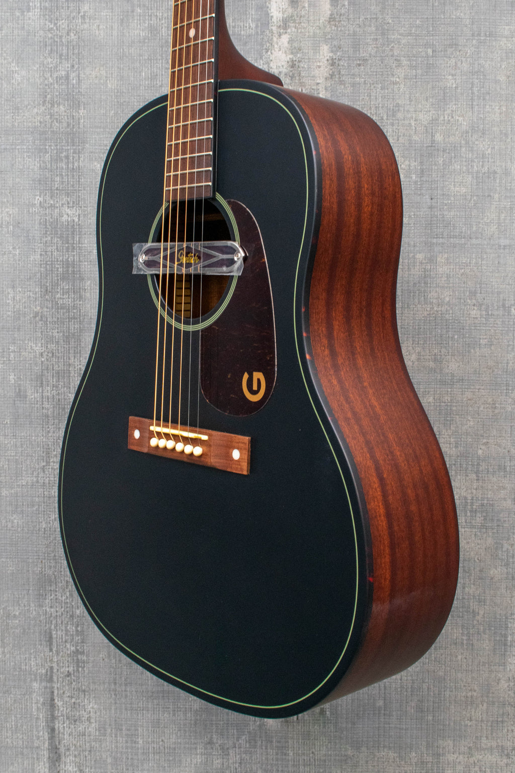 The X-braced body is crafted with select lightweight laminate tonewoods for an optimal balance of woody vintage tone and reliable durability, while the “C”-shape neck presents an inviting feel for hours of old-timey inspiration. The onboard Gretsch Deltoluxe magnetic soundhole pickup produces versatile electrified acoustic tone, providing added utility for live performance, recording, and effects pedals. Period-correct details such as a vintage-style pinned bridge, tortoiseshell binding and “G”-graphic pickguard, painted pinstripe purfling, 3-on-a-plate open-gear tuning machines and oversized dot fingerboard inlays combine for a nostalgic personality destined for any barnburner or jamboree.