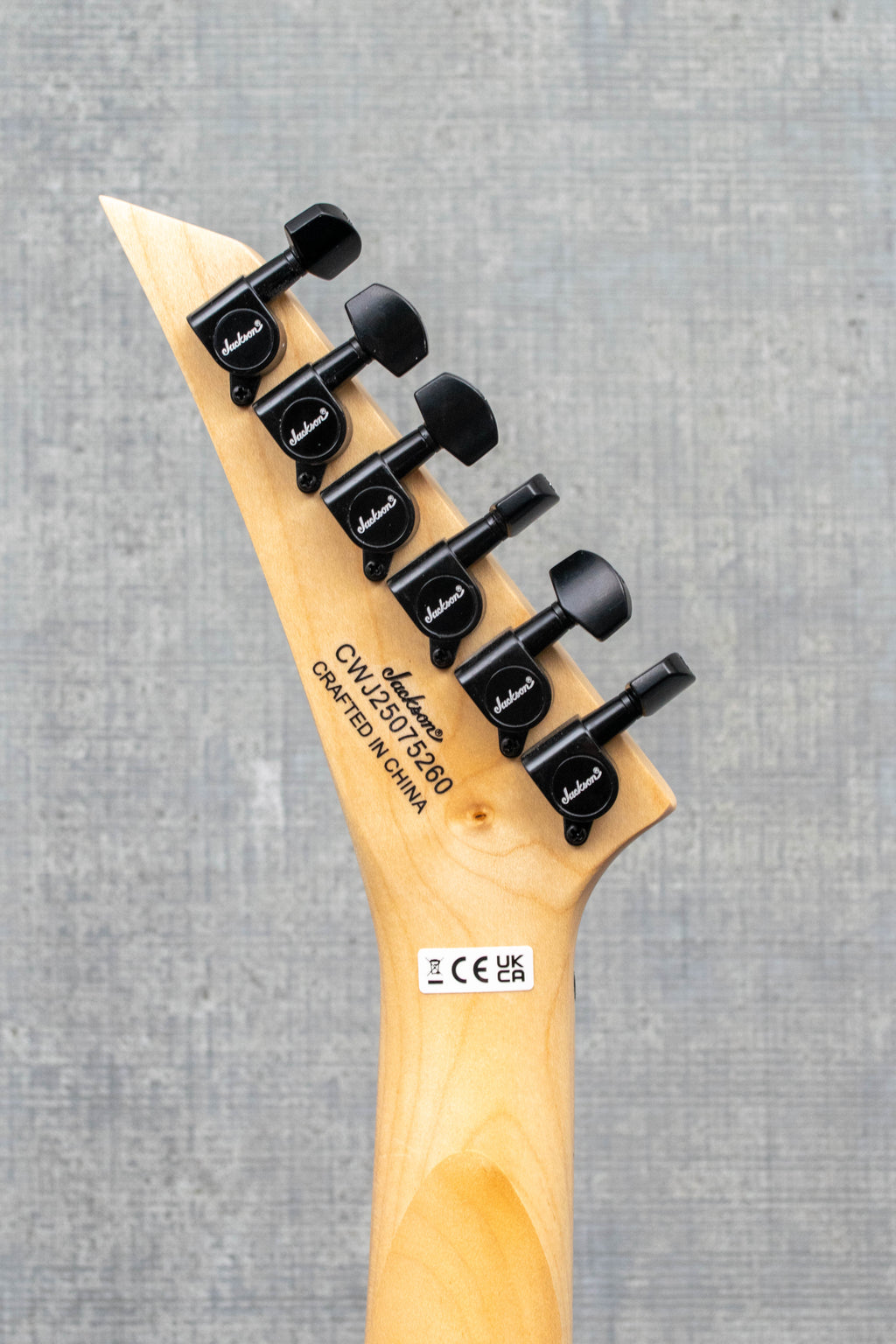 A pair of Jackson high-output humbucking pickups with ceramic magnets crank out clear tone with plenty of girth. The neck position delivers bright highs while the bridge adds plenty of crunchy distortion. Its versatile voice can be shaped with a three-way toggle switch and single volume and tone controls, while a string-through-body hardtail bridge with block saddles improves intonation and sustain.