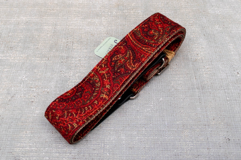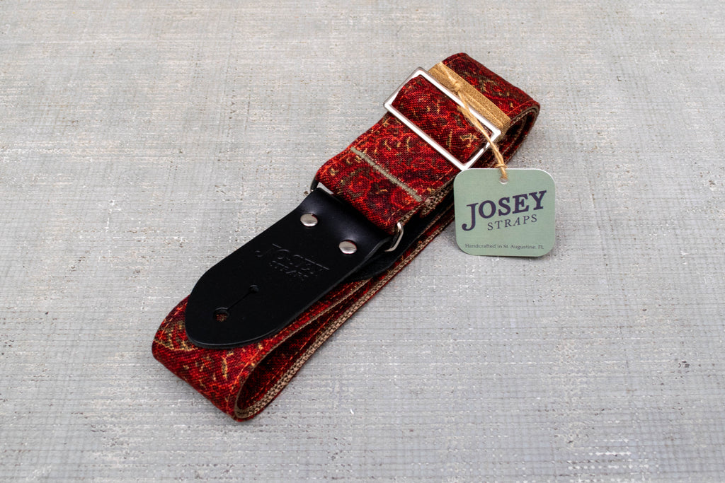 Bold, timeless, and steeped in vintage style, the Cardinal guitar strap from Josey Straps is a true classic. Featuring a rich red paisley design with warm undertones, this strap delivers an old-school elegance that pairs beautifully with any guitar. Crafted with durable woven fabric, reinforced stitching, and premium leather ends stamped with the Josey Straps logo, Cardinal is built for comfort and reliability, and looks gorgeous doing it.