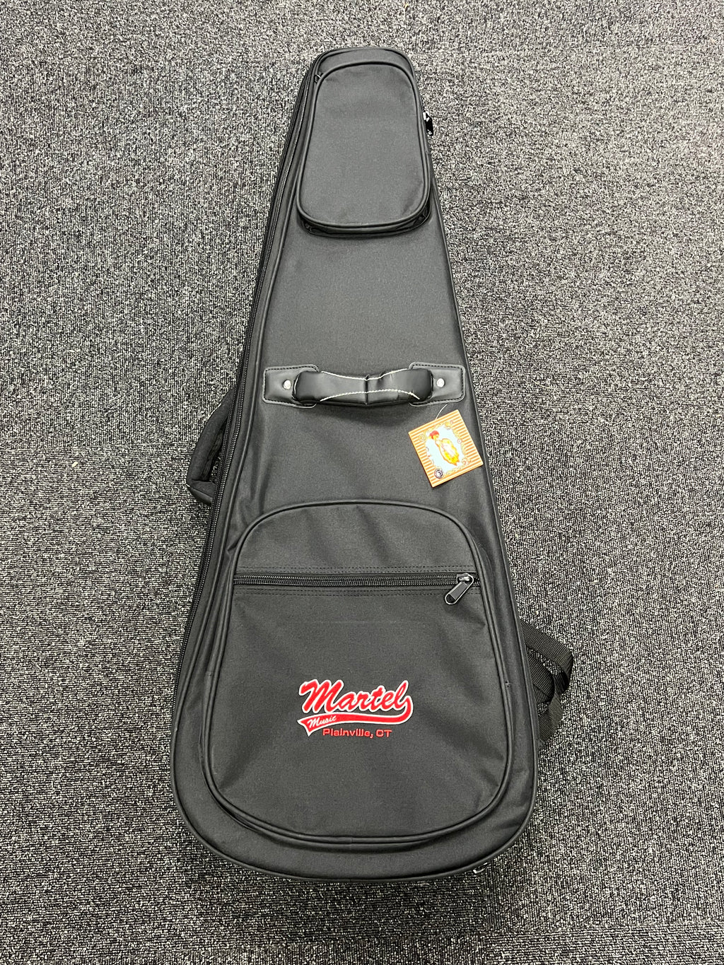 Level 3 Electric Guitar soft case w/ seafoam green interior. 600D Cordura outer shell, 35mm heavy duty foam and zippers, strap button foam core moveable insert, adjustable neck rest with velcro, multiple pockets. Martel Music Logo embroidered on the front pocket.
