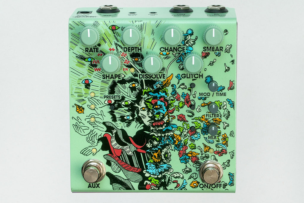 - Knobs to control delay buffer chance and time; reverb smear; random glitching; modulation rate,