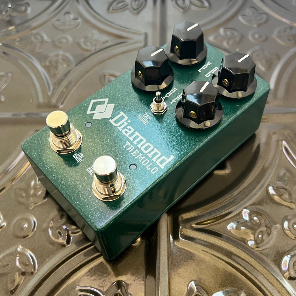 Tremolo has been a staple effect since the 60’s. Now it’s time to welcome it to the 21st century. Don’t let your preconceptions fool you, this is not your average trem. Combining 3 distinct trem flavours into one pedal, the new Diamond Tremolo takes what it means to be a tremolo and pushes it well beyond the limits. At its core, the Diamond Tremolo offers classic amp style, optical amplitude modulation with sine, shark fin and square waveforms. Further enhancing the pedal, a modern FET chopper delivers a sharp edge, completely killed, tremolo effect and a new Dicer mode allows you to arm the pedal and use it as a momentary kill switch. Include the 11 rhythm control positions providing a number of different depth, mode and tempo accents and the updated Diamond Tremolo will be your go-to tone warping machine.