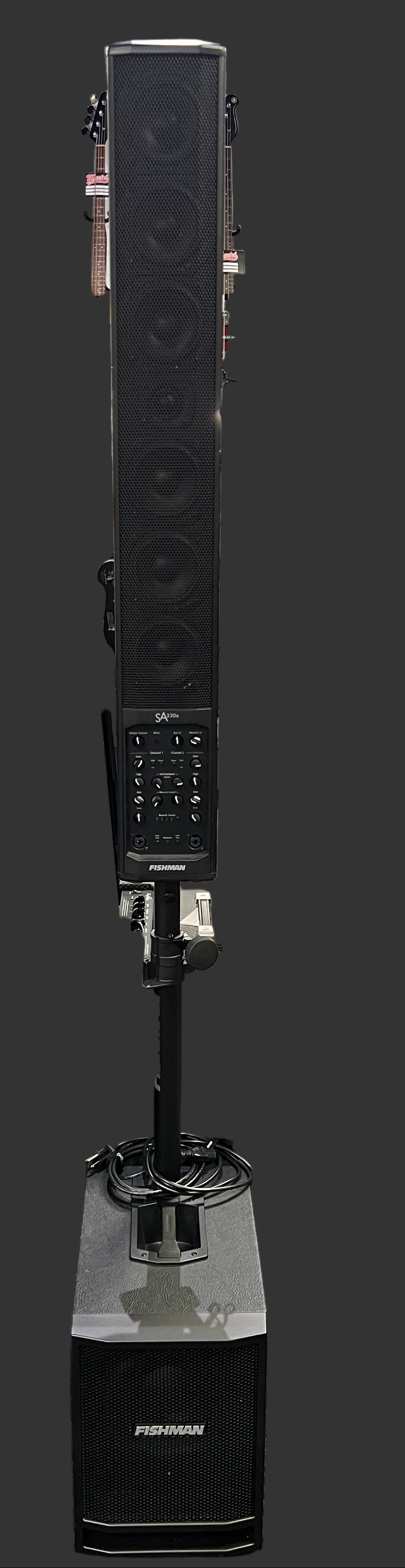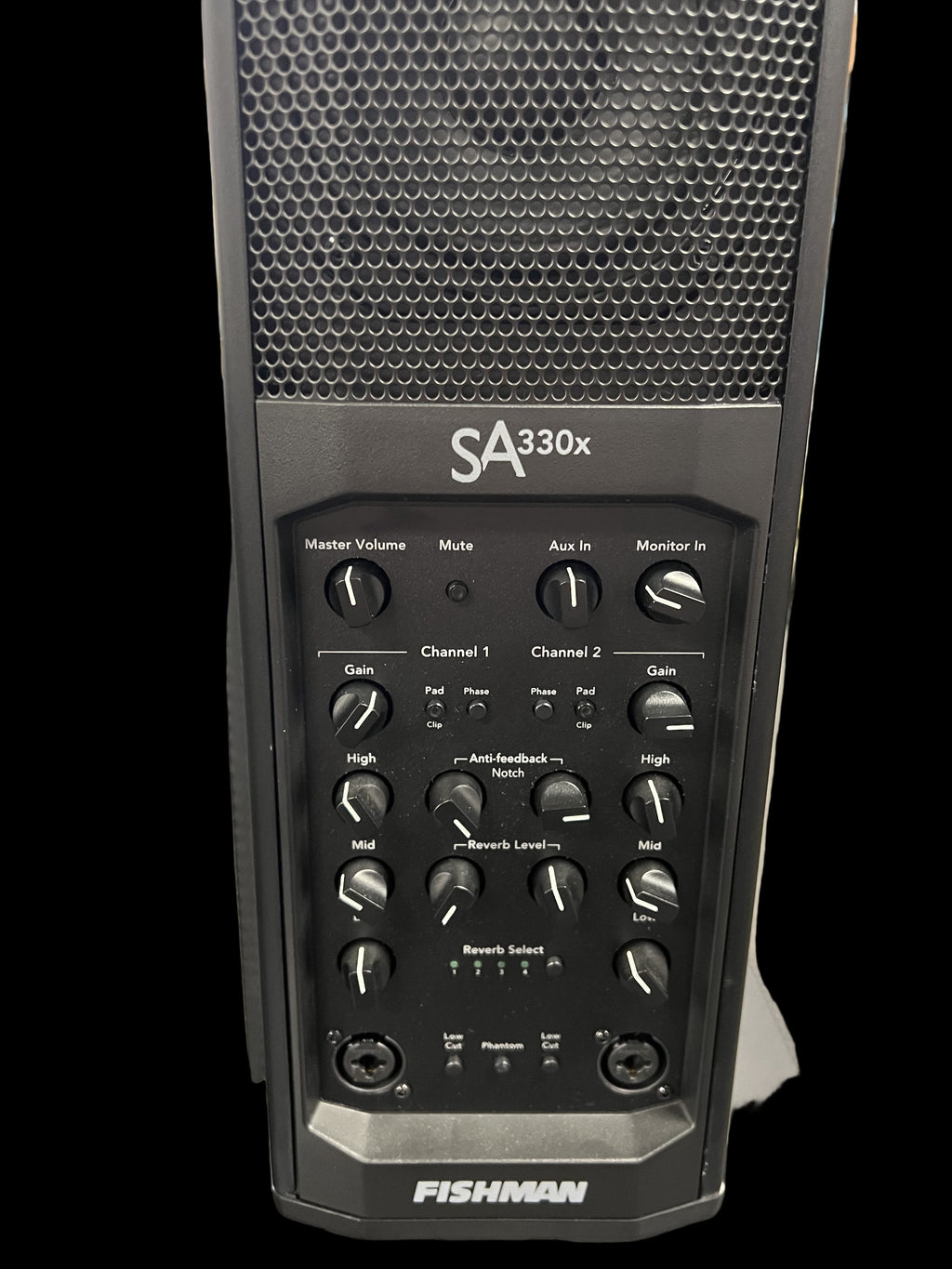 Pre-owned Fishman SA330x Performance Audio System with SA300 SUB. Tripod, and sub mounting stand are both included. Carrying case for the line array, and power cables are included. The sub has had the bottom feet replaced with the Fishman sub feet as well.