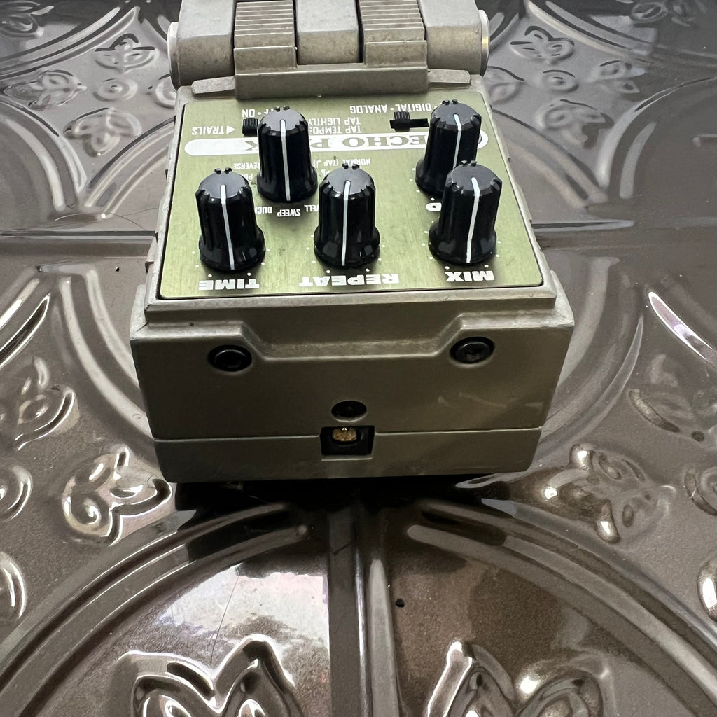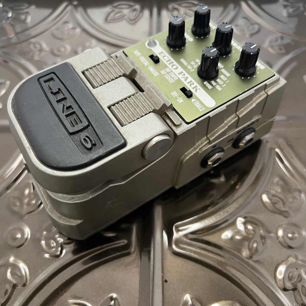 The Line 6 Echo Park is a digital modeling delay pedal (approx. 2006–2010) featuring 11 delay types across Tape, Analog, and Digital modes, based on the DL4 Delay Modeler.
