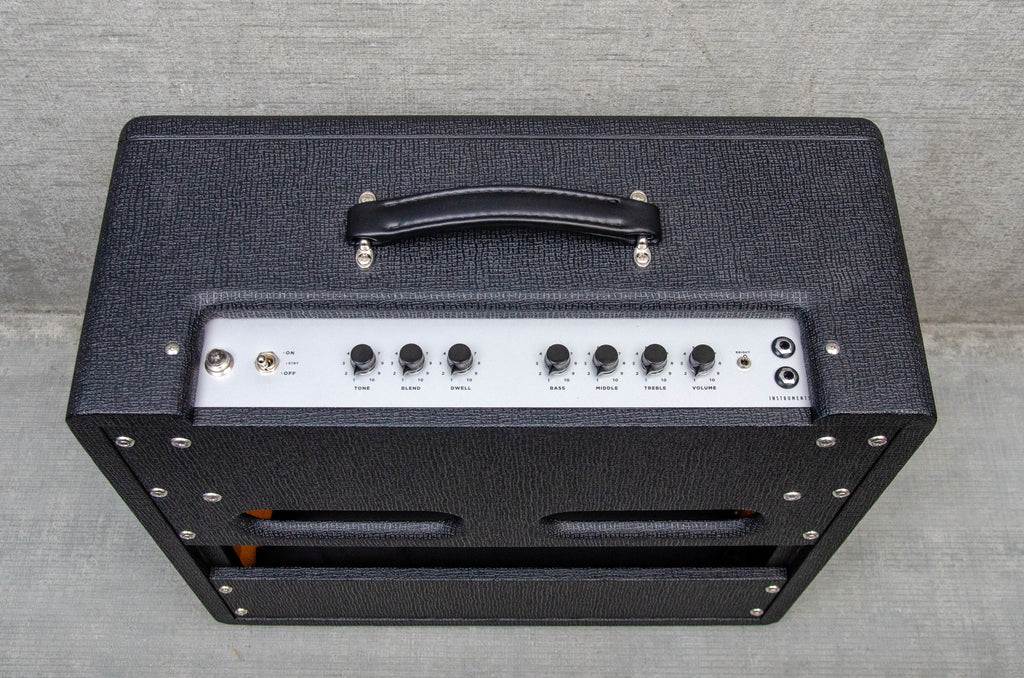 The preamp has controls for volume, treble, midrange and bass as well as a bright switch for low volume fidelity. This is a single channel amplifier with inputs for two instruments. The TV40 has a 5AR4 rectifier tube and like all Milkman amplifiers is hand wired onto a turret board with Mercury Magnetics transformers and Jupiter Capacitors standard. It is built into a custom aluminum chassis and housed in a Pine cabinet.