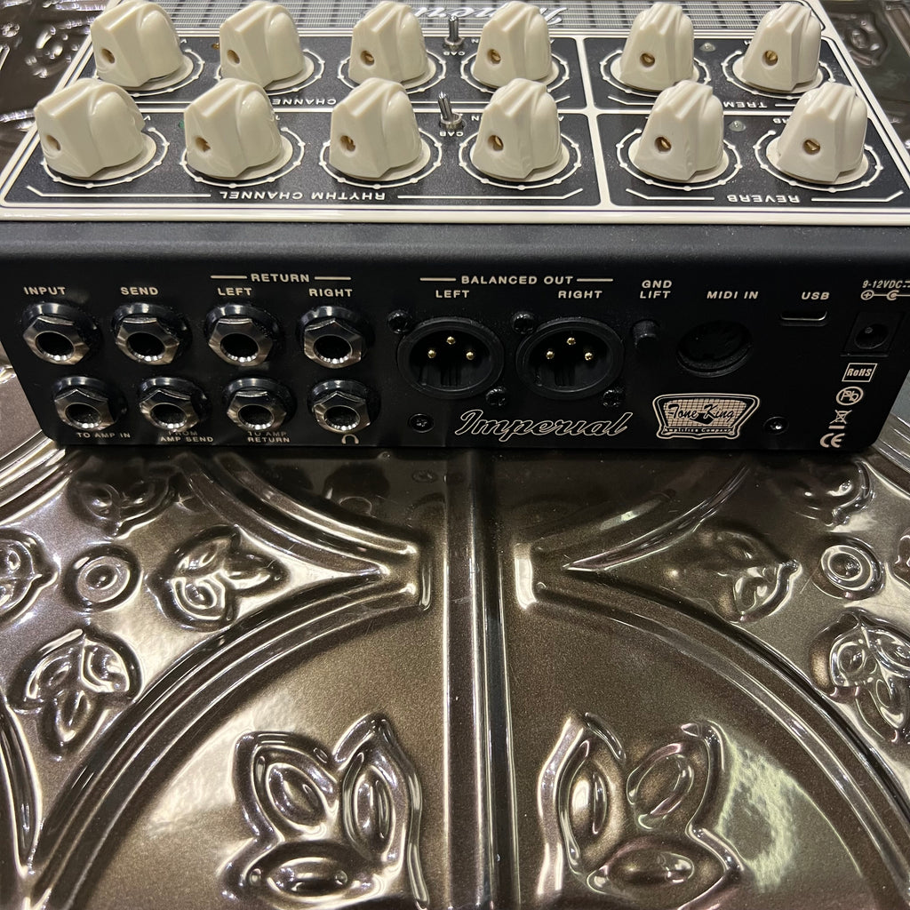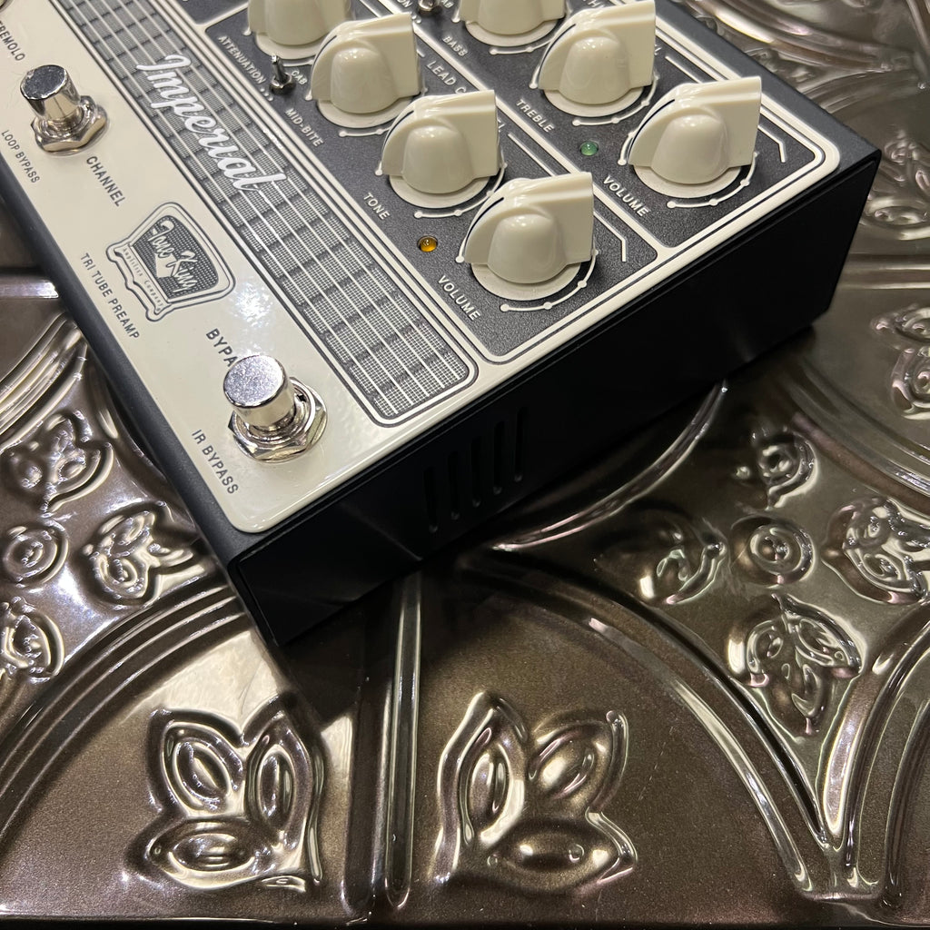 The Imperial All-Tube Preamp pedal delivers Tone King’s legendary MKII amplifier's '50s tweed, '60s blackface, and vintage British rock tones in a compact, pedalboard-friendly format. It features the exact preamp section and phase inverter circuitry of the Imperial MKII amp, as well as Reverb, Tremolo and Attenuation, resulting in a pedal that sings with harmonic richness and blooming touch response. Powered by three 12AX7 preamp tubes running at high voltage, this preamp delivers the amp's sound, responsiveness, and exquisite interaction with your pickups and effects. The onboard, low-latency impulse response (IR) loader (per channel), Headphones, easy integration and expansion with your existing gear, and MIDI capabilities, takes these iconic tones into the new era of guitar playing.