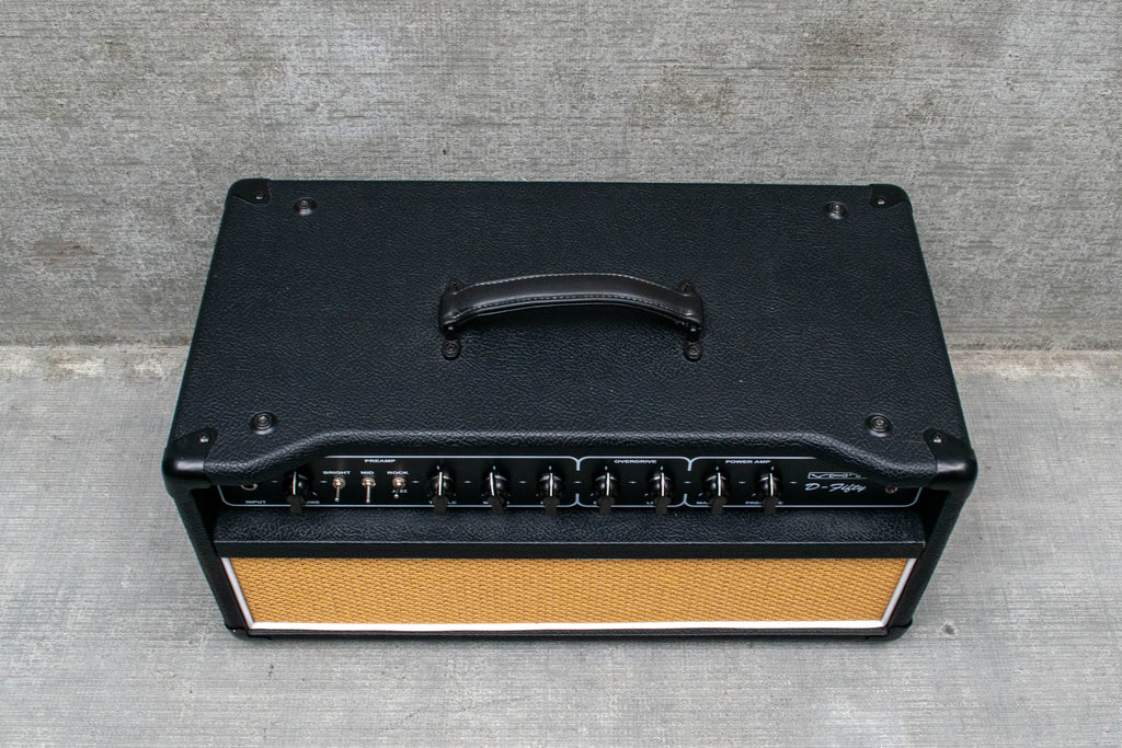 The D-Fifty head is VHT’s take on an extremely rare and iconic boutique amplifier. It's handwired on eyelet boards, and has three 12AX7 preamps and two Ruby Tubes 6L6GC output tubes.